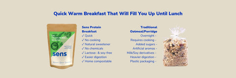Let’s be very straightforward, compared with traditional breakfast alternatives, Sens protein breakfast is made with natural ingredients you can actually understand and doesn't have any chemicals, additives, or artificial sweeteners. It’s ready in only 5 minutes without requiring the time and patience to cook or prepare overnight. And what is even better, it has 100% home compostable packaging.