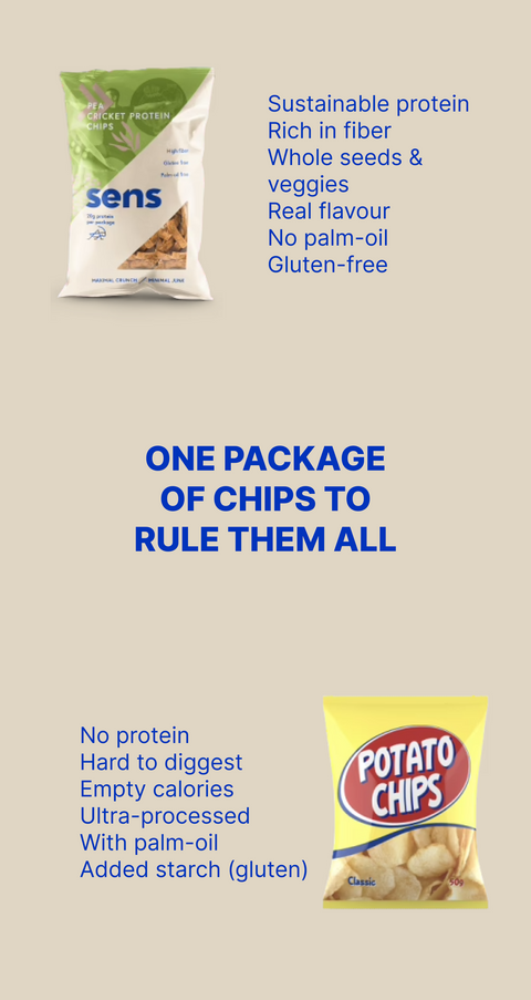 A standard bag of potato chips is a bag of empty calories. They are high in calories, fat and sodium but are low in everything else. As a result, you only get hungry even after consuming a bunch, and with its addictiveness… better hide that bag somewhere. Sens protein chips on the other hand have 20g of high-quality protein packed also with 8g of fiber. They are nutritionally balanced while still flavourful and addictive as normal chips. We also don't use any low-quality oils or palm oil.