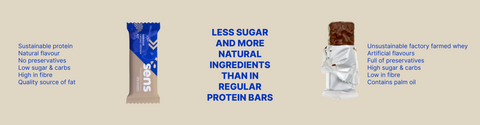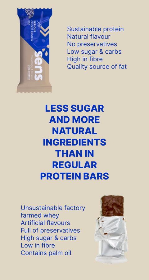 Regular high protein bars are either full of sugars or chemicals. Just look at their long ingredient list! Our SERIOUS bars also have 25% of protein, which consist of a mix of high quality cricket protein and plant protein. The bars are processed as little as possible with mostly natural ingredients and low carbohydrate content.